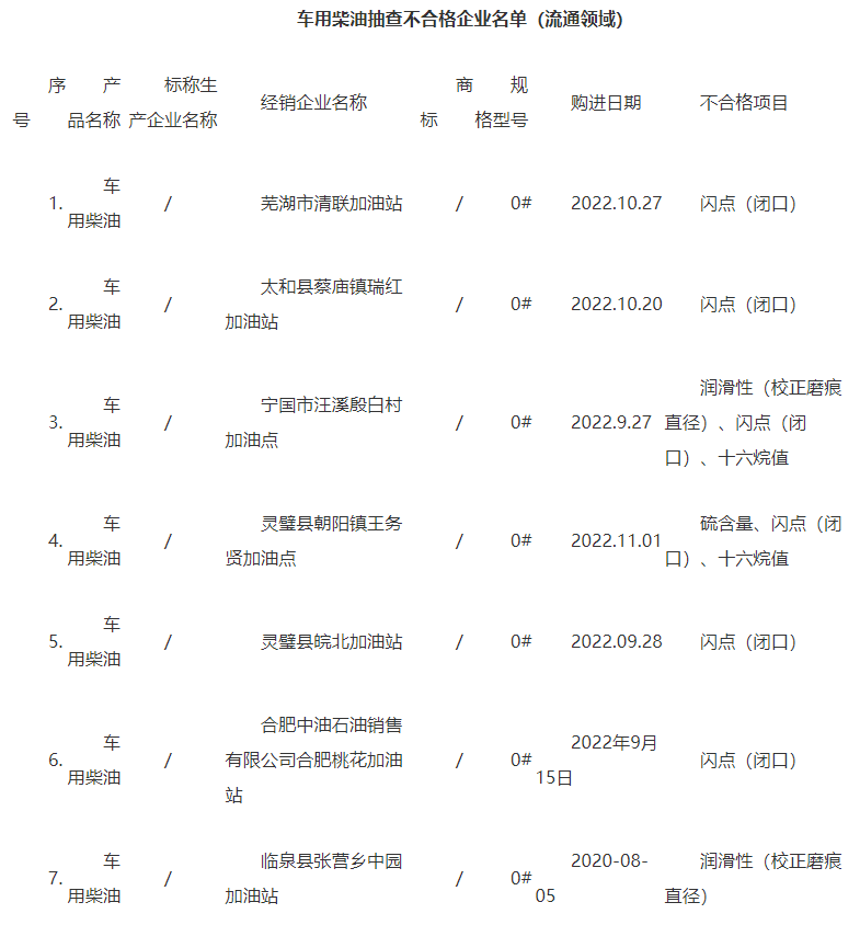 据了解,本次抽查的车用柴油共在安徽省内14个地市抽取了500组样品,均在流通领域抽查。其中,合肥市抽查了120组、阜阳市抽查了91组,宣城市抽查了65组,芜湖市抽查了45组,宿州市抽查了45组,马鞍山市抽查了35组,淮南市抽查了22组,淮北市抽查了20组。亳州市抽查了15组,蚌埠市抽查了14组,滁州市抽查了14组,铜陵市抽查了11组,安庆市抽查了2组,池州市抽查了1组。经检验,合格493组,合格率为98.6%;不合格7组,不合格率为1.4%。