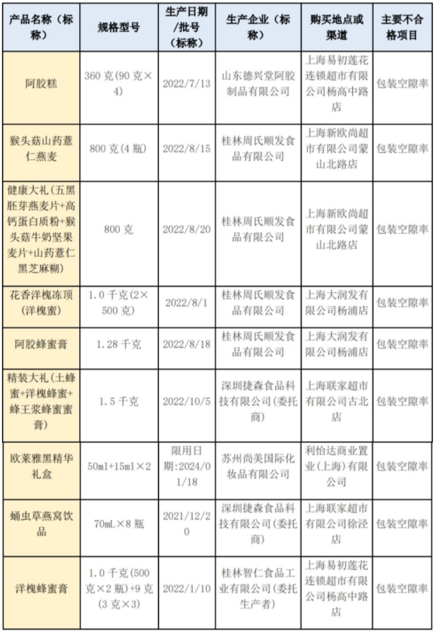据介绍,本次监督抽查依据GB 23350《限制商品过度包装要求 食品和化妆品》等标准要求,对包装空隙率、包装层数项目进行了检验。有9批次产品不合格,不合格项目均为包装空隙率。
