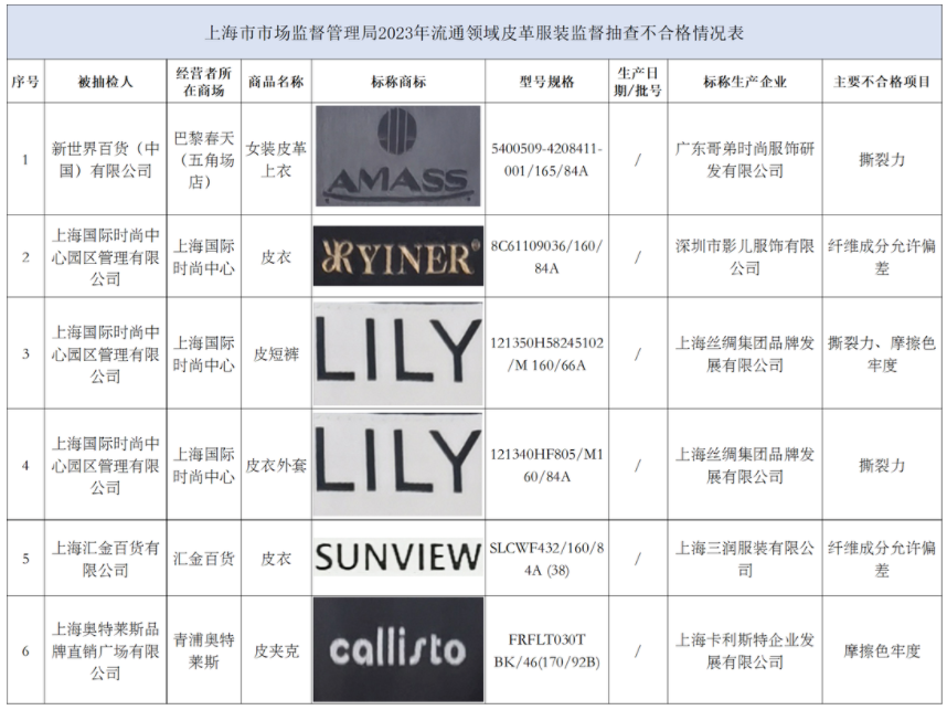 2月13日,上海市市场监管局发布皮革服装监督抽查情况。抽检结果显示,有6批次产品不合格,涉及AMASS、callisto、 LILY等品牌。