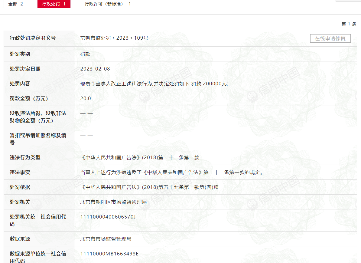 行政处罚决定书京朝市监处罚【2023】109号显示,当事人涉嫌违反《广告法》第二十二条第一款规定,依据《广告法》第五十七条第一款第(四项),责令其改正违法行为并处以罚款20万元。