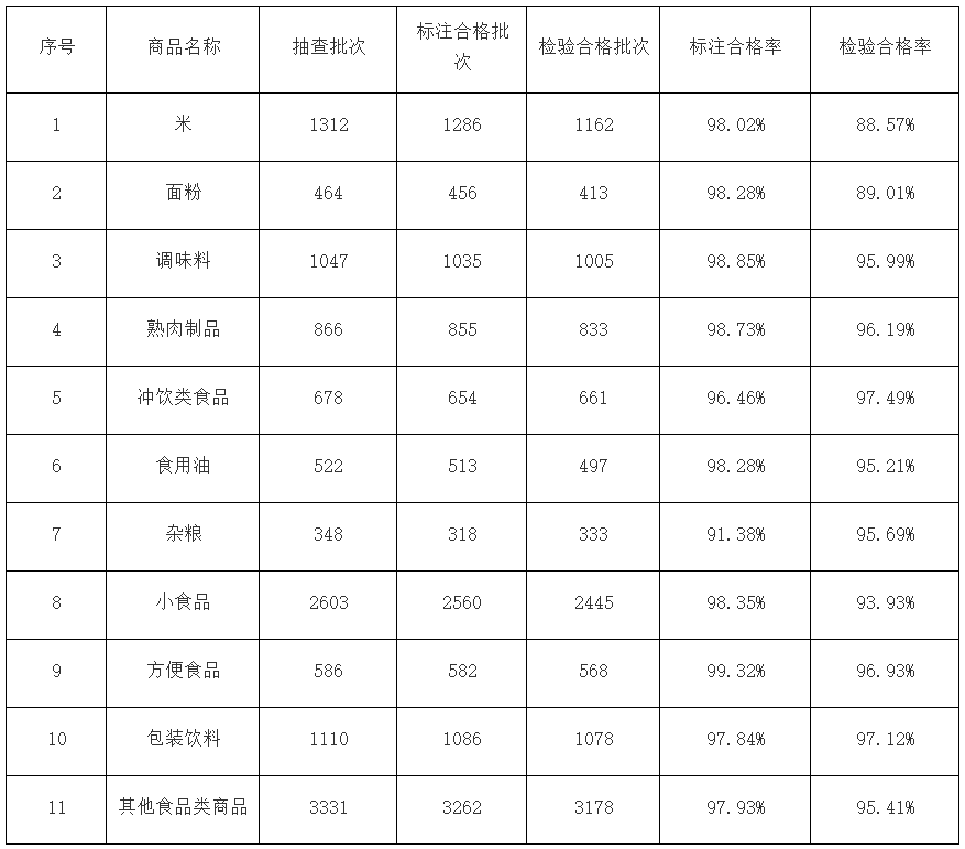 此次定量包装商品净含量计量监督专项检查在全国31个省、自治区、直辖市和新疆生产建设兵团部署开展,共抽查企业6037家,抽查食品类、日用品类、农资建材类以及其他种类定量包装商品共计17611批次,其中,净含量标注合格17189批次,净含量标注抽样合格率为97.60%;净含量检验合格16719批次,净含量检验抽样合格率为94.93%。