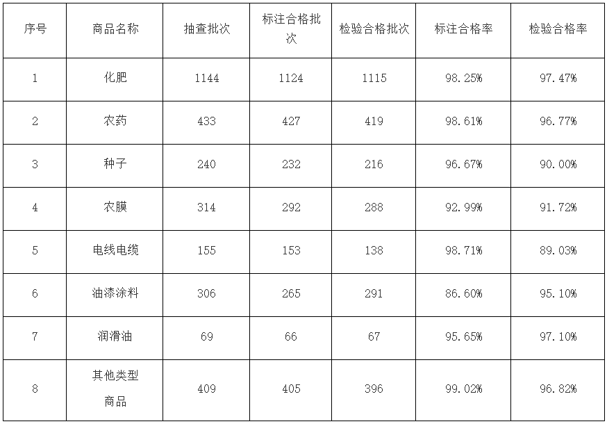 从商品类别看,食品类定量包装商品净含量标注抽样合格率为97.98%,净含量检验抽样合格率为94.61%;日用品类定量包装商品净含量标注抽样合格率为96.65%,净含量检验抽样合格率为96.54%;农资建材及其他类定量包装商品净含量标注抽样合格率为96.55%,净含量检验抽样合格率为95.44%。不同类别商品在净含量标注抽样合格率和检验抽样合格率方面均大体保持在同一水平。从具体商品来看,油漆涂料的净含量标注抽样合格率和米、面粉、电线电缆的净含量检验抽样合格率低于90%,相对偏低。各商品种类具体情况如下: