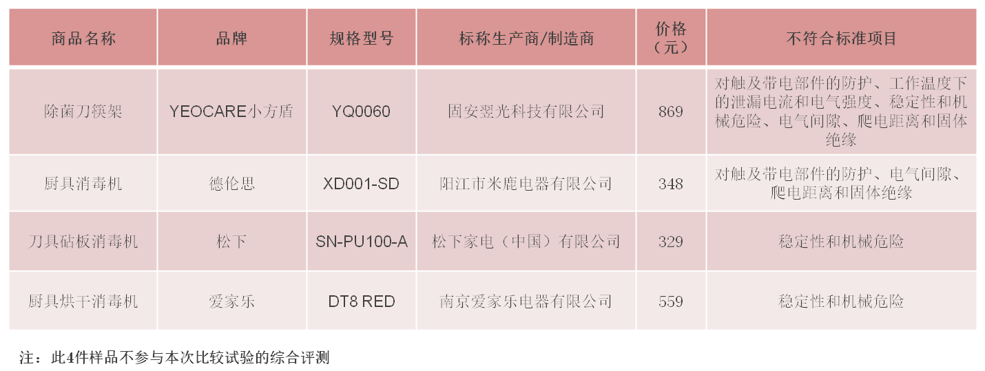 结果显示,4款样品不符合电气安全国家标准,因此不参与本次比较试验的综合评测。其中,标称生产商/制造商为阳江市米鹿电器有限公司的德伦思厨具消毒机(规格型号:XD001-SD),对触及带电部件的防护、工作温度下的泄漏电流和电气强度、稳定性和机械危险、电气间隙、爬电距离和固体绝缘项目不符合标准。标称生产商/制造商为松下家电(中国)有限公司的松下刀具板消毒机(规格型号:SN-PU100-A),稳定性和机械危险项目不符合标准。