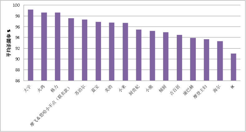 为比较不同样品间杀菌性能差异,此次比较试验依据国家标准GB28235—2020《紫外线消毒卫生要求》,以大肠杆菌、金黄色葡萄球菌作为细菌代表,以白色念珠菌作为真菌代表,将样品测试运行时间统一设定为60分钟,分别对竹筷、刀具、砧板3种常用厨具开展杀菌性能测试。综合测试结果,杀菌表现最好的一款样品是标称生产商/制造商为广东大宇科技实业有限公司的大宇菜板餐具保洁机(规格型号:DY-DJ07),平均杀菌率为99.2%;杀菌表现最弱的一款样品是标称生产商/制造商为浙江中广电器集团股份有限公司的IK智能消毒刀筷架(规格型号:IK-DJ-01),平均杀菌率为91.0%;杀菌表现其次略弱的样品是标称生产商/制造商为青岛海尔智护电器有限公司的海尔刀筷除菌机(规格型号:HY-SDK1)、标称生产商/制造商为宁波摩登主妇家居用品制造有限公司的摩登主妇多功能消毒器(XDQ-01)。