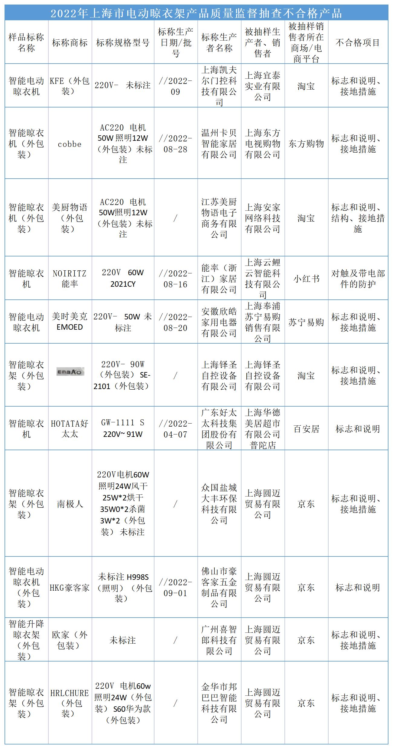 3月21日,上海市市场监管局公布上海市电动晾衣架产品质量监督抽查情况。抽检结果显示,不合格的有11批次(其中电商平台销售的不合格产品达10批次),不合格发现率为24.4%。主要不合格项目为标志和说明、对触及带电部件的防护、结构、接地措施等安全性指标,涉及KFE、NOIRITZ能率、南极人等品牌。