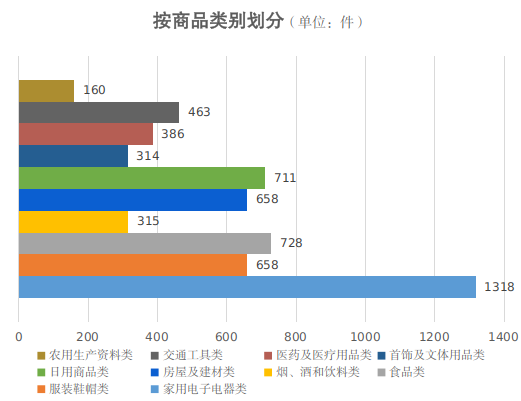 1、商品类。根据投诉商品分析(如图所示),家用电子电器类1318件,占23.08%;食品类728件,占12.75%;日用商品类711件,占12.45%;服装鞋帽类658件,占11.52%;房屋及建材类658件,占11.52%;交通工具类463件,占8.11%;医药及医疗用品类386件,占6.76%;烟、酒和饮料类315件,占5.52%;首饰及文体用品类314件,占5.50%;农用生产资料类160件,占2.80%;其中,家用电子电器类、食品类、日用商品类、服装鞋帽类、房屋及建材类占据了消费者投诉的前五位。