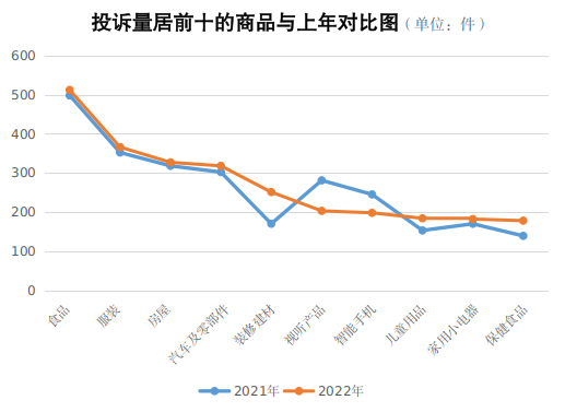 在具体商品投诉中,2022年投诉量居前十位的是:食品、服装、房屋、汽车及零部件、装修建材、视听产品、智能手机、儿童用品、家用小电器、保健食品,除视听产品和智能手机外,投诉量均较上年有所增长。