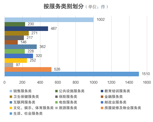 2、服务类。根据投诉服务分析(如图所示),生活、社会服务类1510件,占26.74%;销售服务1002件,占17.74%;房屋装修及物业服务526件,占9.31%;教育培训服务487件,占8.62%;互联网服务362件,占6.41%;邮政业服务320件,占5.67%;卫生保健服务271件,占4.80%;文化、娱乐、体育服务252件,占4.46%;公共设施服务230件,占4.07%;电信服务228件,占4.04%;保险服务217件,占3.84%;金融服务146件,占2.58%;旅游服务97件,占1.72%;其中,生活、社会服务类、销售服务、房屋装修及物业服务、教育培训服务、互联网服务占据了消费者投诉的前五位。