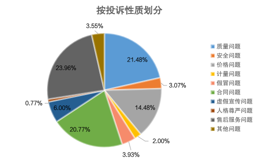 根据投诉性质分析(如图所示),售后服务2781件,占23.96%;质量2493件,占21.48%;合同2410件,占20.77%;价格1681件,占14.48%;虚假宣传696件,占6.00%;假冒456件,占3.93%;其他412件,占3.55%;安全356件,占3.07%;计量232件,占2.00%;人格尊严89件,占0.77%;其中,售后服务、质量、合同、价格、虚假宣传占据了消费者投诉的前五位。与上年相比,售后服务投诉仍居投诉总量首位,有关价格方面的投诉占比下降趋势最为明显,假冒和安全的投诉占比上升幅度较大。