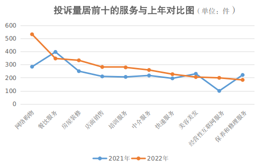 在具体服务投诉中,2022年投诉量居前十位的是:网络购物、餐饮服务、房屋装修、店面销售、培训服务、中介服务、快递服务、美容美发、经营性互联网服务、保养和修理服务。其中网络购物和经营性互联网服务投诉量增长最为明显,分别增长87.32%和101.01%。