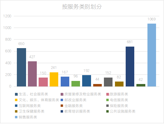 2、服务类。根据投诉服务分析(如图所示),销售服务1069件,占26.77%;教育培训服务681件,占17.05%;生活、社会服务类650件,占16.28%;房屋装修及物业服务427件,占10.69%;文化、娱乐、体育服务241件,占6.04%;互联网服务192件,占4.81%;邮政业服务167件,占4.18%;保险服务152件,占3.81%;旅游服务150件,占3.76%;电信服务96件,占2.40%;卫生保健服务82件,占2.05%;金融服务44件,占1.10%;公共设施服务42件,占1.05%;其中,销售服务、教育培训服务、生活及社会服务类、房屋装修及物业服务、文化和娱乐及体育服务占据了消费者投诉的前5名。