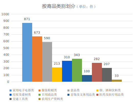 1、商品类。根据投诉商品分析(如图所示),家用电子电器类871件,占24.05%;服装鞋帽类673件,占18.58%;食品类590件,占16.29%;日用商品类343件,占9.47%; 房屋及建材类310件,占8.56%;医药及医疗用品类282件,占7.79%;烟、酒和饮料类213件,占5.88%;交通工具类207件,占5.72%;首饰及文体用品类100件,占2.76%;农用生产资料类33件,占0.91%;其中,家用电子电器类、服装鞋帽类、食品类、日用商品类、房屋及建材类占据了消费者投诉的前5名。