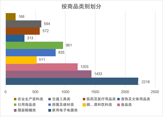 1、商品类。根据投诉商品分析,家用电子电器类2218件,占25.19%;服装鞋帽类1433件,占16.27%;食品类1203件,占13.66%;日用商品类961件,占10.91%;房屋及建材类835件,占9.48%;交通工具类594件,占6.75%;医药及医疗用品类572件,占6.5%;烟、酒和饮料类511件,占5.8%;首饰及问题用品类313件,占3.55%;农用生产资料类166件,占1.89%;其中,家用电子电器类、服装鞋帽类、食品类、日用商品类、房屋及建材类占据了消费者投诉的前五位。