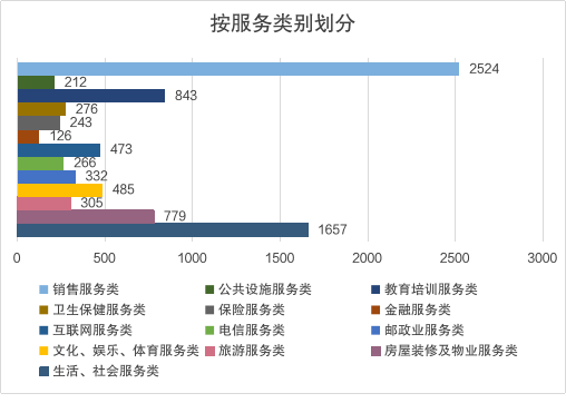 2、服务类。根据投诉服务分析,销售服务2524件,占29.62%;生活及社会服务类1657件,占19.45%;教育培训服务843件,占9.89%;房屋装修及物业服务779件,占9.14%;文化、娱乐、体育服务485件,占5.69%;互联网服务473件,占5.55%;邮政业服务332件,占3.9%;旅游服务305件,占3.58%;卫生保健服务276件,占3.24%;电信服务266件,占3.12%;保险服务243件,占2.85%;公共设施服务212件,占2.49件%;金融服务126件,占1.48%;其中,销售服务、生活、社会服务类、教育培训服务、房屋装修及物业服务、文化、娱乐、体育服务占消费者投诉的前五名。