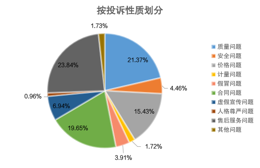 根据投诉性质分析(如图所示),售后服务4168件,占23.84%;质量3737件,占21.37%;合同3436件,占19.65%;价格2698件,占15.43%;虚假宣传1214件,占6.94%;安全780件,占4.46%;假冒683件,占3.91%;其他303件,占1.73%;计量300件,占1.72%;人格尊严167件,占0.96%;其中,售后服务、质量、合同、价格、虚假宣传占据了消费者投诉的前5名。