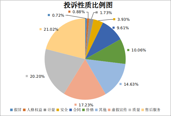 根据投诉性质(如图1所示),售后服务问题占21.02%,质量问题占20.2%,虚假宣传问题占17.23%,其他问题占14.63%,价格问题占10.06%,合同问题占9.61%,安全问题占3.93%,计量问题占1.73%,人格权益问题占0.88%,假冒问题占0.72%。其中,售后服务、质量、虚假宣传、其他问题、价格占据了消费者投诉的前五位。与第二季度相比(如表1所示),虚假宣传,售后服务问题投诉比重上升,质量,安全,价格问题投诉比重下降。