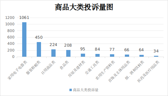 1.商品类。根据投诉商品分析(如图所示),家用电子电器类1061件,占28.17%;服装鞋帽类450件,占11.95%;日用商品类224件,占5.95%;食品类208件,占5.52%;房屋及建材类95件,占2.52%;交通工具类84件,占2.23%;农用生产资料类77件,占2.04%;首饰及文体用品类66件,占1.75%;烟、酒和饮料类64件,占1.70%;医药及医疗用品类34件,占0.90%;2024第三季度投诉量居前五位的是家用电子电器类、服装鞋帽类、日用商品类、食品类、房屋及建材类。