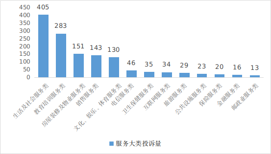 2.服务类。根据投诉服务分析(如图所示),生活、社会服务405件,占10.75%;教育培训服务283件,占7.51%;房屋装修及物业服务151件,占4.01%;销售服务143件,占3.80%;文化、娱乐、体育服务130件,占3.45%;电信服务46件,占1.22%;卫生保健服务35件,占0.93%;互联网服务34件,占0.90%;旅游服务29件,占0.77%;公共设施服务23件,占0.61%;保险服务20件,占0.53%;金融服务16件,占0.42%;邮政业服务13件,占0.35%;其中,生活及社会服务类、教育培训服务类、房屋装修及物业服务类、销售服务类、文化、娱乐、体育服务类占据了消费者投诉的前五位。