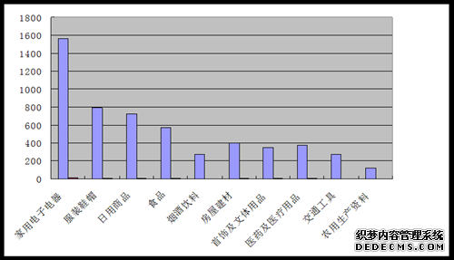 2014年,商品大类投诉中,家用电子电器类1561件,占投诉总量的18%。其余各类商品分别为:服装鞋帽类791件,占投诉总量9.12%;日用商品类724件,占投诉总量8.35%;食品类571件,占投诉总量6.59%;烟、酒饮料类277件,占投诉总量3.19%;房屋及建材类405件,占投诉总量4.67%;首饰及文体用品类356件,占投诉总量4.11%;医药及医疗用品类372件,占投诉总量4.29%;交通工具类274件,占投诉总量3.16%;农用生产资料类123件,占投诉总量1.42%。