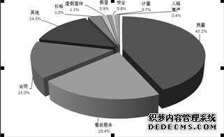 根据投诉性质(如图1所示),质量问题占43.2%,售后服务问题占20.4 %,合同问题占15.0%,价格问题占3.0%,虚假宣传1.3%,假冒问题占0.9%,安全问题占0.8%,计量问题占0.7%,人格尊严占0.4%,其他占14.3%。产品质量、售后服务和合同问题仍是引发投诉的主要原因,占投诉总量的七成以上。