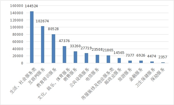 生活社会服务类、互联网服务、教育培训服务、文化娱乐体育服务与销售服务居于服务类投诉量前五位。与2020年相比,教育培训服务投诉量比重上升1.99%,销售服务投诉比重下降2.92%。