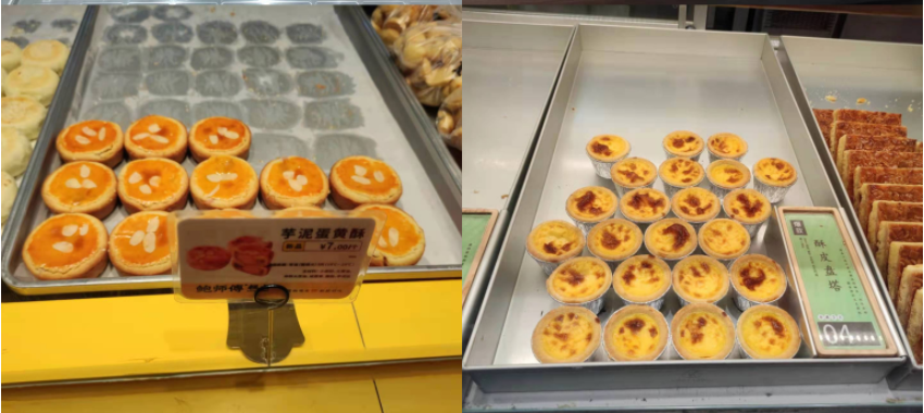 不同于预包装食品,新式点心多数属于现制现售食品。但无论是预包装食品还是散装食品,生产日期、保质期、贮存条件、产品配料等这些必要信息是消费者选购新式点心时的重要参考。此次比较试验采样过程中发现各新式点心铺的标签标识不尽相同,不同程度上存在一些问题,应引起相关经营企业重视。如有22款样品在销售柜台标签上未标注配料表,容易导致消费者误食过敏源食品;19款样品未在销售柜台设置统一生产日期公示牌或在产品外包装上标注生产日期;15款样品未在销售柜台标签或产品包装盒上标注食品的保质期、贮存条件等信息。