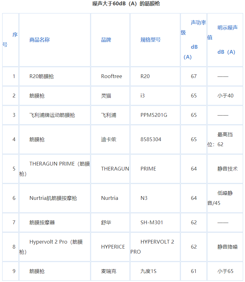 筋膜枪需贴近人体使用,过高的噪声容易让使用者产生不适,30款样品中多款样品明示具有静音降噪的性能。根据标准QB/T4412—2012《手持式电动按摩器》要求,对于振动式按摩器和锤击式按摩器,其声功率级不应大于60dB(A)。30款样品中,10款样品检测的噪声值高于明示数据;声功率级超过60dB(A)的筋膜枪有9款,这9款筋膜枪最大挡位(空载)运行时,噪声明显高于其他款筋膜枪,其中Rooftree的R20型筋膜枪的声功率级最大,达到67dB(A)。