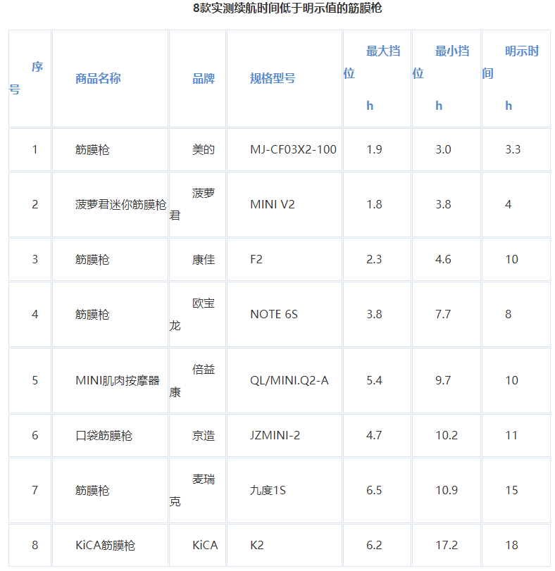 二是明示续航时间的信息不完整。仅舒华SH-M301型筋膜枪和迈普QL/DMS.M2-C型筋膜枪在明示续航时间中分别列出了最高挡和最低挡的续航时间,其余品牌均未提及该续航时间对应的运行状,这不利于消费者选购筋膜枪时正确判断。