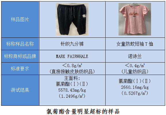 氯菊酯是一种杀虫剂。过量氯菊酯残留,可能存在一定的安全隐患和健康风险。根据测试结果分析,MARK FAIRWHALE、诺诗兰2款样品氯菊酯含量明显超出T/CTCA 3—2017《氯菊酯防蚊面料》 标准要求。