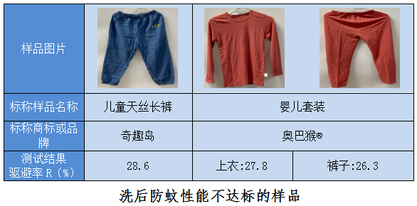 测试结果显示,20款样品洗前防蚊性能、甲醛含量、pH值、可分解致癌芳香胺染料、纤维成分含量项目均符合指标要求,但奇趣岛儿童天丝长裤、奥巴猴婴儿套装(上衣、裤子)3款样品洗后防蚊性能不达标,MARK FAIRWHALE针织九分裤、诺诗兰女童防蚊短袖T恤2款样品氯菊酯指标偏高。(测试结果详见附件)