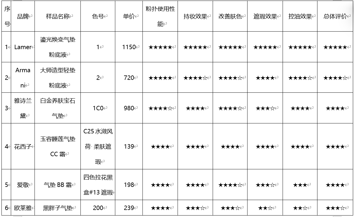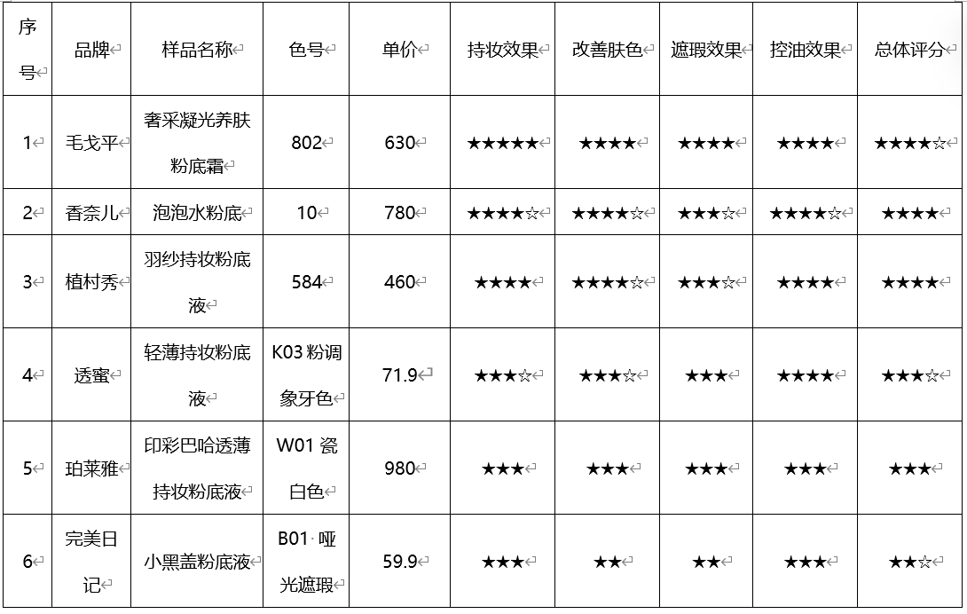 宁波市消保委邀请了15名体验者,分发编盲的无包装产品。体验后,分别从持妆效果、遮瑕效果、改善肤色、控油效果4个方面对每个产品进行满意度评分,并记录详细体验感受。测评结果见下图(“★”符号越多,满意度得分越高,“☆”代表半个“★”的满意度得分)