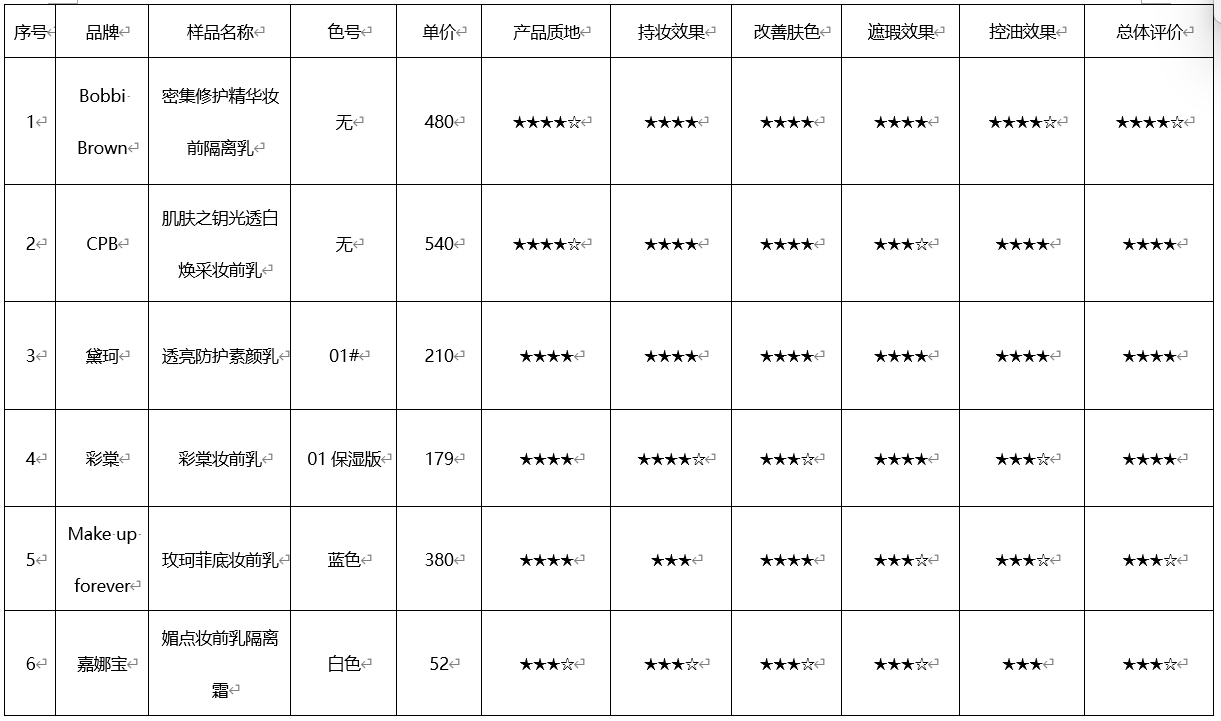 宁波市消保委邀请15名体验者,分发编盲的无包装产品。体验后,分别从产品质地、持妆效果、改善肤色、控油效果、遮瑕效果5个方面对每个产品进行满意度评分,并记录详细体验感受。测评结果见下图(“★”符号越多,满意度得分越高,“☆”代表半个“★”的满意度得分)