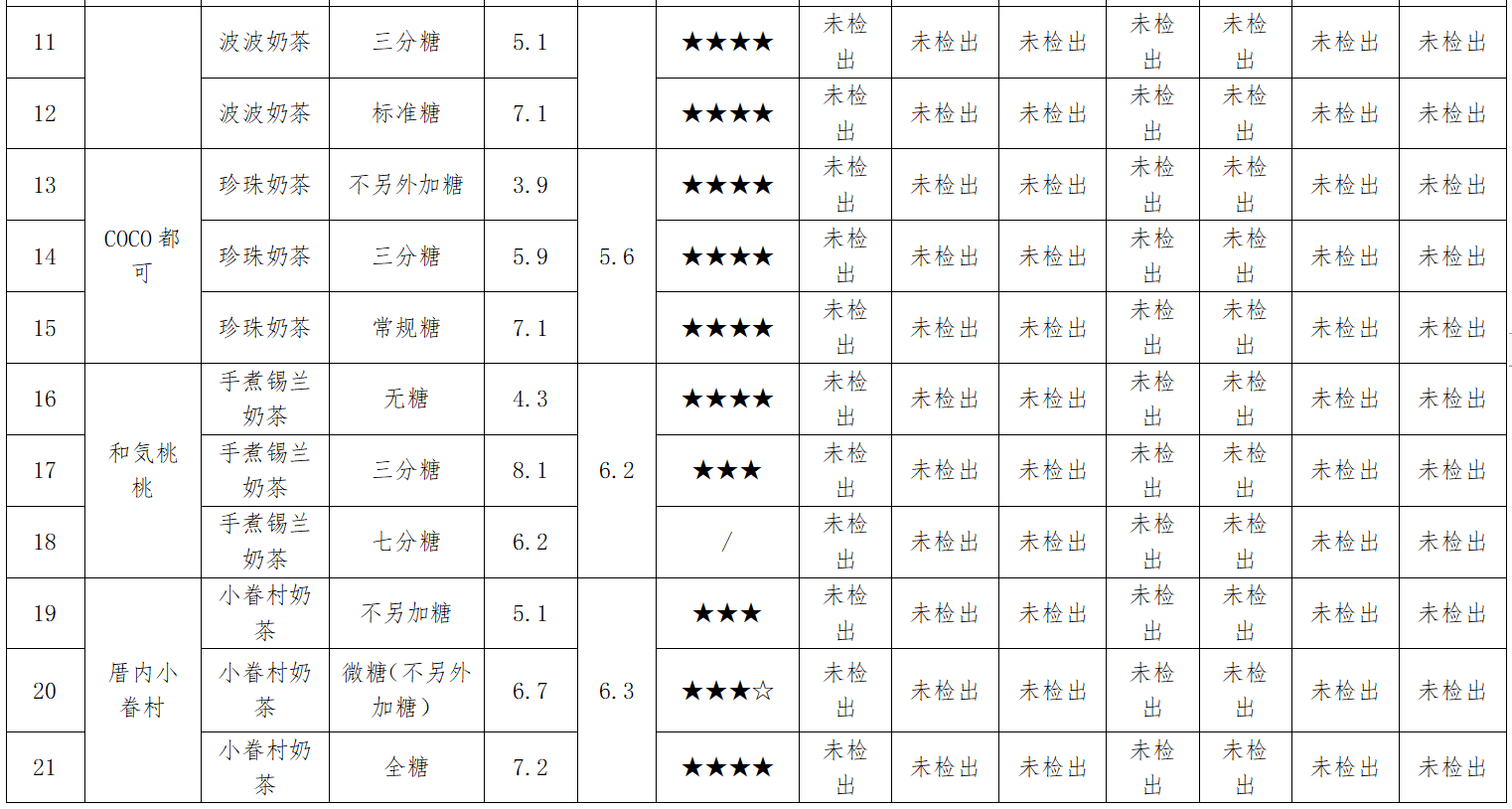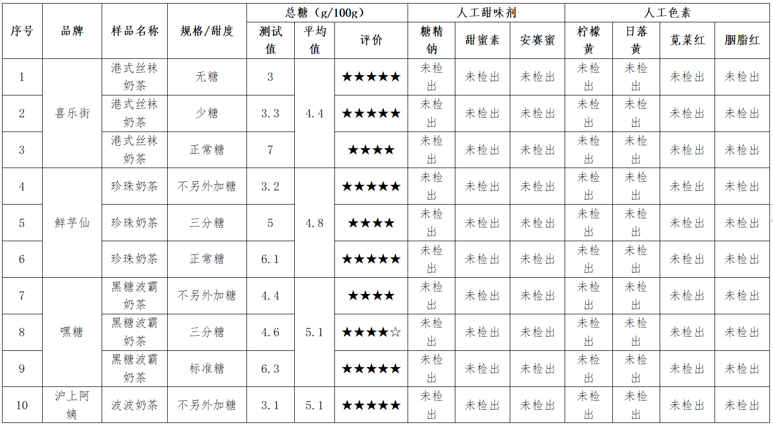 据介绍,本次比较试验样品由消保委工作人员在辖区内商场周边模拟消费者消费习惯购买而得。样品共计33批次,涉及喜乐街、鲜芋仙、嘿糖、沪上阿姨等11个品牌,每个品牌分别购买了不另外加糖(微糖)、三分糖、标准糖(全糖)3种甜度。部分品牌由于奶茶的甜度设定不一,购买的是临近甜度的奶茶,数据仅供参考。本次检测的主要项目有8项:总糖,人工合成色素柠檬黄、日落黄、苋菜红、胭脂红,人工甜味剂糖精钠、甜蜜素、安赛蜜,其中,总糖为重点项目。