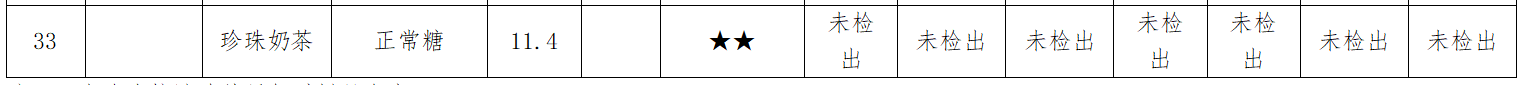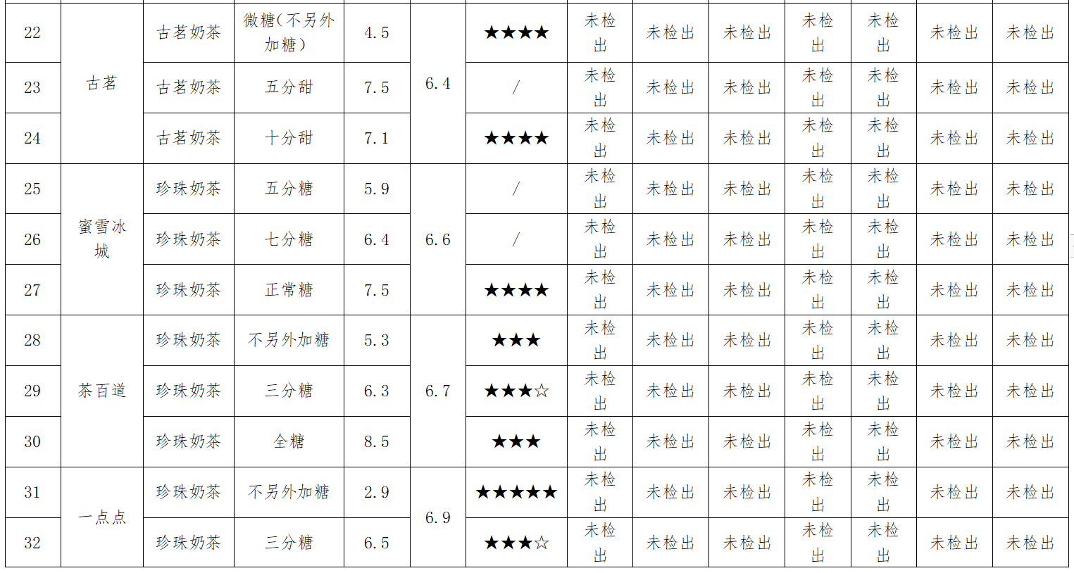 本次测试的33批次样品的总糖含量实测值为2.9克/100克至11.4克/100克。不另外加糖的总糖含量均值为3.97克/100克;三分甜的总糖含量均值为5.72克/100克;标准糖(全糖)的总糖含量均值为7.53克/100克。各品牌不同甜度规格样品的总糖含量均值中,最高的是一点点品牌,均值为6.9克/100克;其次是茶百道品牌,均值为6.7克/100克;再次是鲜芋仙品牌,均值为4.8克/100克;最低的是喜乐街品牌,均值为4.4克/100克。