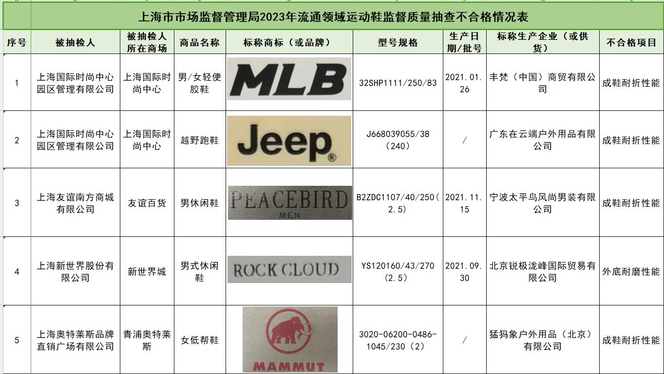 针对消费者投诉、举报集中及质量问题较多的产品,近期,上海市市场监管局对黄浦、闵行、浦东、青浦、徐汇、杨浦、长宁7个区域15家企业销售的39个品牌40批次运动鞋进行了监督抽查。5月5日,上海市市场监管局发布运动鞋监督抽查情况。抽检结果显示,有5批次产品不合格,不合格检出率为12.5%,涉及Jeep、ROCK CLOUD等品牌。