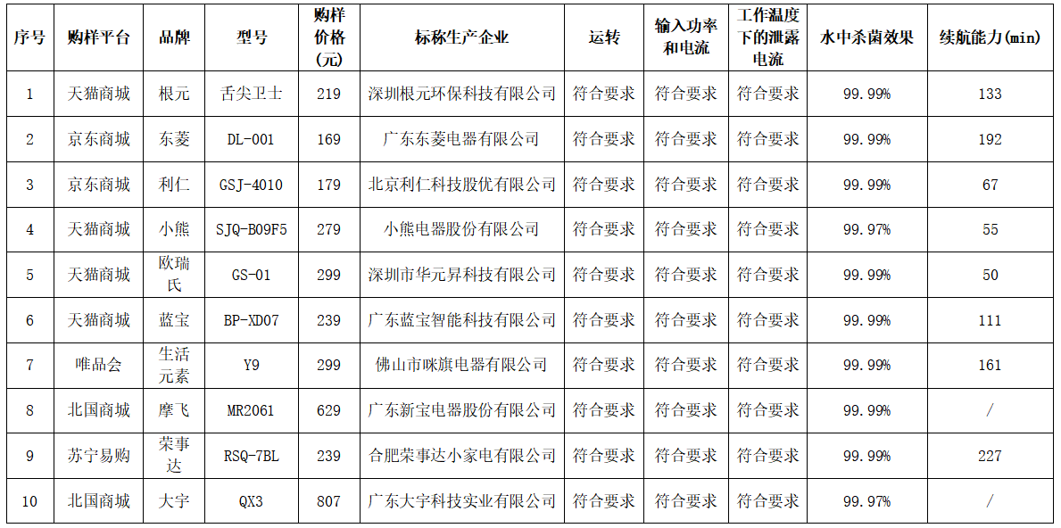 本次比较试验从京东商城、天猫商城、唯品会、拼多多、苏宁易购等5家电商平台随机购买13个样本,从石家庄北国商城购样2个,购买价格从123元到807元不等。依据相关标准主要对运转、输入功率和电流、工作温度下泄漏电流和电气强度、水中消菌效果、续航能力等5项指标进行检测。