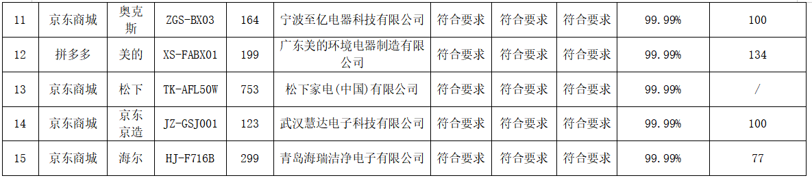 此外,本次比较试验还对15个样本的除菌效果进行了测试,结果显示效果均良好。参照SB/T 11190—2017《果蔬净化清洗机》标准,选用大肠菌群作为除菌测试的试验菌种,对水中菌落总数清洗前后进行测试,并采用清洗前后菌落总数的对比来表示产品的除菌效果。数据显示,15个样本中,有13个样本菌落总数去除率达到99.99%,标称小熊牌SJQ-B09F5型号的果蔬清洗机、标称大宇牌QX3型号的果蔬清洗机2个样本的菌落总数去除率达到99.97%,除菌效果良好。
