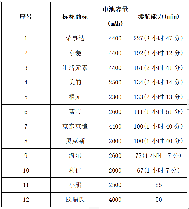 运转和续航能力两项功能性指标,15个样本经检测也均符合标准要求。运转能力方面,15个样本装配后加水运转时,启动灵活、运转平稳、动作可靠,紧固件连接可靠无松动,未出现有阻滞、卡塞现象。续航能力方面,本次比较试验样本中有3个有线型号样本和12个无线型号样本。12个无线型号样本中,10个样本续航能力与电池容量成正比,小熊、欧瑞式2个样本的电池容量高但续航能力较弱。