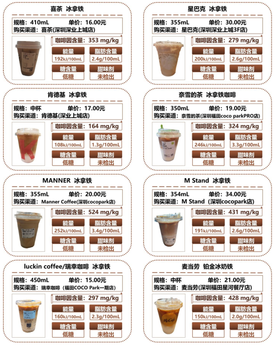 记者从深圳市消委会了解到,2023年11月至今年2月,深圳市消委会对市面上售销的24款现制咖啡饮品开展比较试验,测评参照GB 7101—2022《食品安全国家标准 饮料》、GB/T 30767—2014《咖啡类饮料》、GB 2760—2014《食品安全国家标准 食品添加剂使用标准》等国家标准,对样品的理化指标(咖啡因含量)、营养指标(能量、脂肪、总糖)、甜味剂(糖精钠、阿斯巴甜、安赛蜜、甜蜜素)等项目进行检测。