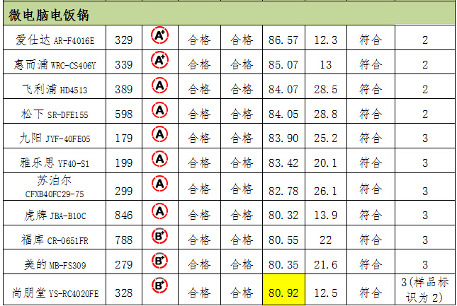 4.尚朋堂的微电脑电饭锅YS-RC4020FE能效虚标。尚朋堂该样品热效率实测值为80.92%,实测能效等级为三级,标识值为大于84%,标识能效等级为二级,出现虚标情况。