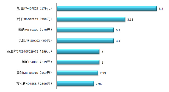 1.在全部样品中,九阳微电脑样品电饭锅煮出来的米饭口感最好。经消费者测评,全部8款电饭锅样品得分见图二。其中,九阳JYF-40FE05(179元)煮出来的米饭口感得到测评者一致认可,综合得分3.4分,位列第一;而飞利浦HD4558煮出来的米饭口感得分最低,2.96分,但其价格是本次比较试验26款电饭锅中价位最高的,2399元。