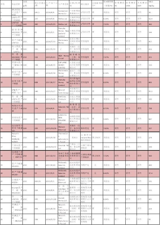 另一方面,根据MGS(新西兰官方认可的麦卢卡蜂蜜认证标准)官网发布,MGO含量小于300mg/kg的麦卢卡蜂蜜不具备显著的抗菌品质。本次25款麦卢卡蜂蜜中,MGO实测大于300mg/kg的产品共8款,另有17款麦卢卡蜂蜜MGO实测含量小于300mg/kg;而这17款麦卢卡蜂蜜平均价格为71.6元/100g,是国产蜂蜜平均价格6.8元/100g的10倍(对比深圳消委会前期国产蜂蜜比较试验产品价格)。