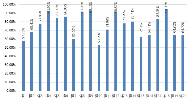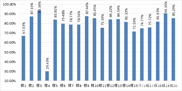 通过测试,20款样品中清洁能力最好的是样品3,清洁率达到93.34%,样品4清洁率为29.63%,相比最低,主要是因为样品4的集尘器较小,不能吸附更多测试物。测试结果详见图4所示。