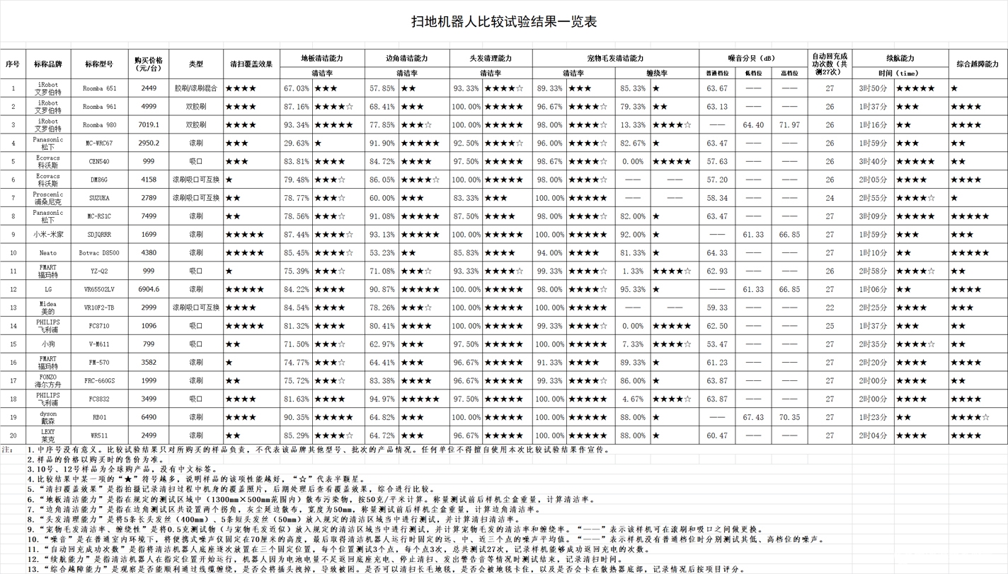 有了扫地机器人是否就不用动手扫地了,扫拖一体的扫地机器人真的可以做到一尘不染吗?扫地机器人的覆盖率好不好,对房间边角清洁能力和越过地面障碍物的能力如何?另外,机器人工作时的噪音大小、操控方式(手机APP、远程、遥控器等)、清扫路径规划等等又怎样呢?机器人在无人情况下进行清扫工作是否安全?带着这些问题,中国消费者协会对市场上销售的二十款扫地机器人产品开展了比较试验,对样机的性能、安全等关键项目进行测试和比较。为消费者选购安全、高性能的扫地机器人产品提供客观信息。