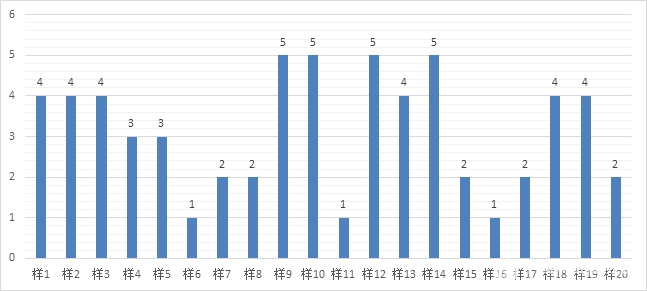 部分样品为了防止机器将充电底座拖走,设计为底座周边默认不清扫;有些较贵的样品也出现了小部分的遗漏;有部分样品在此次规定的清扫时间当中,遗漏明显,覆盖率较低。此次还加入了桌子下面的覆盖情况(此图不展示),综合得出了20款样品的覆盖率性能,将样品的覆盖率进行综合比较评分,最高位5分,最低为1分。样品9、10、12、14号的清扫覆盖效果表现比较优秀。详见图3。