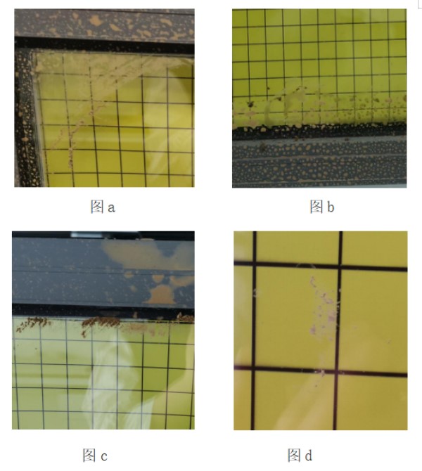 通过观察清洁后的玻璃,发现方形履带式擦窗机器人遗漏区域主要集中在内框的四个角上(图a),椭圆形旋转式擦窗机器人除了角落外,上下边缘的覆盖率也较低(图b)。此外,10款擦窗机器人在边框内侧都有不同程度的泥土堆积现象(图c),2#BOBOT(WIN701)、3#玻妞(HOBOT-298)、7#赫特(W55)、8#福玛特(W600)对于较干的污渍无法彻底清除(图d)。