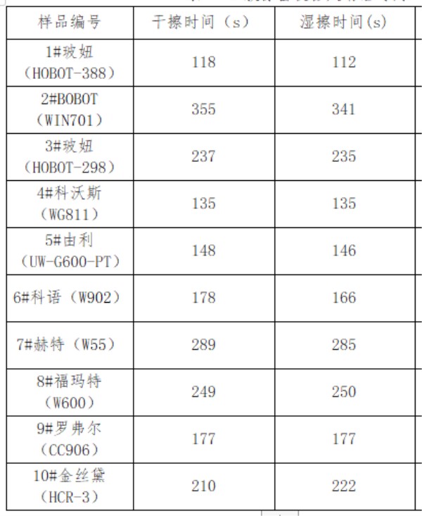 清洁效率主要考察擦窗机器人擦拭相同面积、等量污渍的玻璃所需时间。通过测试,10款样品的清洁效率差异明显。清洁时间最长的2#BOBOT(WIN701)样品需要348秒才可擦拭完成一面玻璃,耗时最短的1#玻妞(HOBOT-388)样品仅需115秒(见表1)。