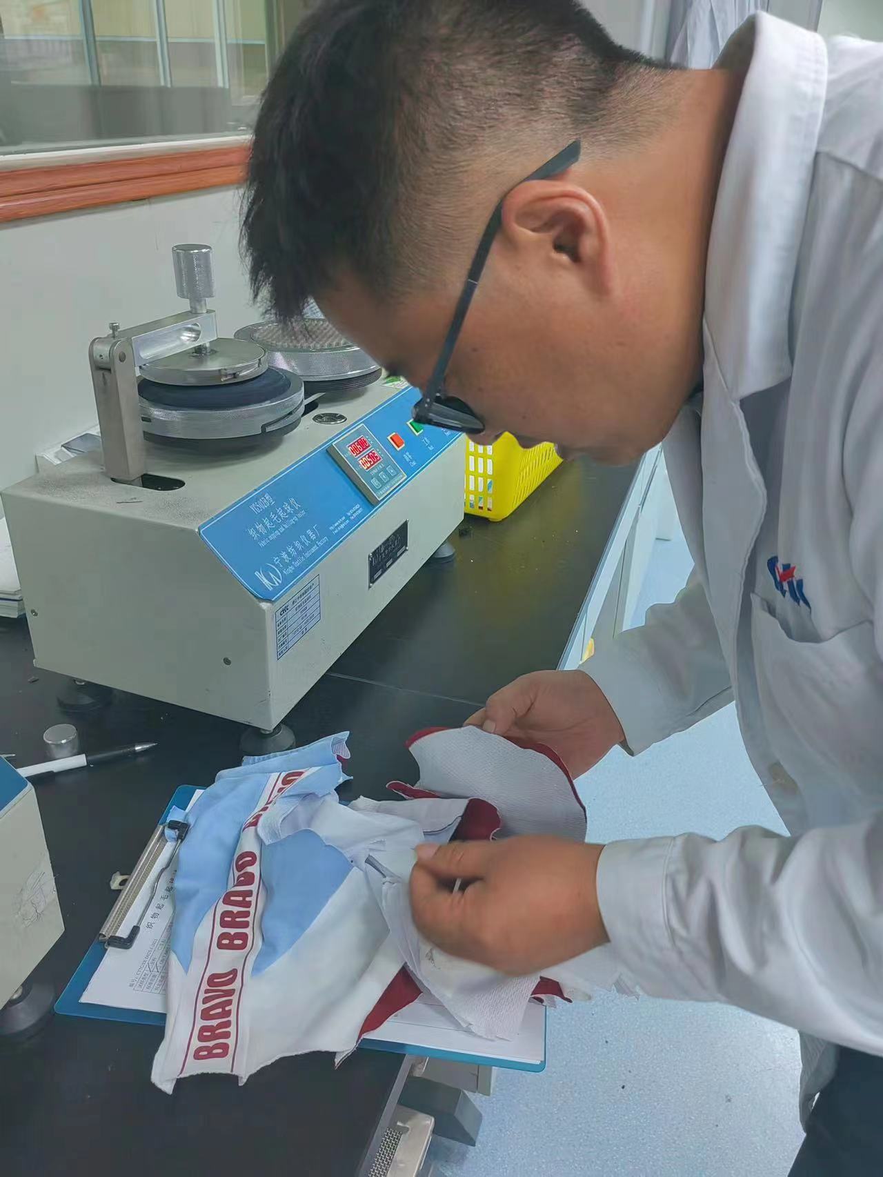 第三方检测机构正在对宁波市消保委购买的校服样品进行检验。资料图片
