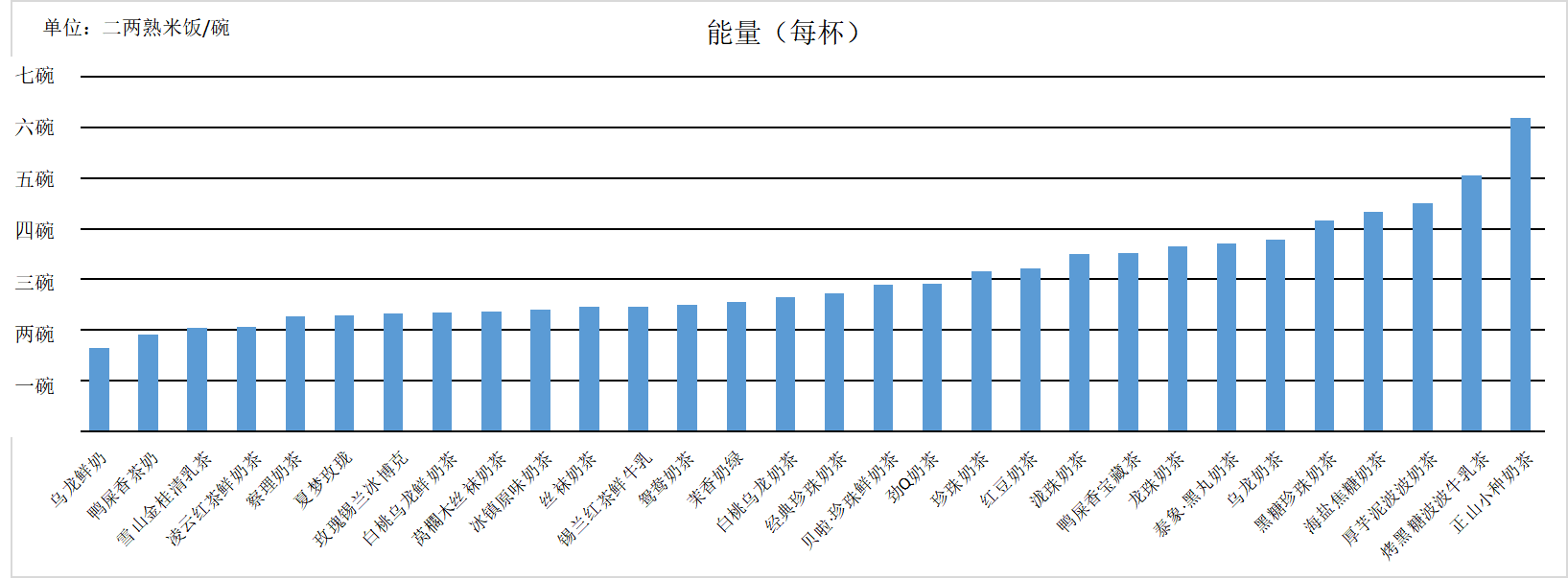 测试显示,30款奶茶样品能量最高为3005kJ/杯(以500g/杯计,下同),最低为795kJ/杯。正常情况下,1碗二两蒸米饭热量约有485kJ,以二两蒸米饭为标准,30款奶茶样品能量值大致相当于1.6—6碗米饭能量值之间。