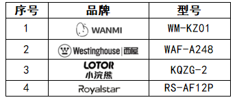 记者了解到,4款不符合国家相关标准要求的产品分别为WANMI(型号WM-KZ01)、西屋(型号WAF-A248)、小浣熊(型号KQZG-2)以及Royalstar(型号RS-AF12P)。